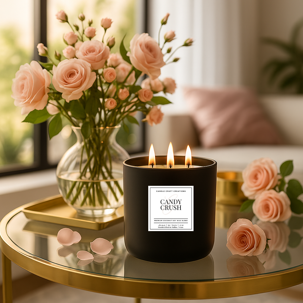 Step into a sweet dream with Candy Crush, a delightful candle that combines the playful scents of fluffy cotton candy, creamy vanilla, and buttery caramel. Imagine strolling through a carnival, surrounded by the joyful aroma of your favorite sugary treats. Each time you light this candle, you'll be transported to a world of fun and nostalgia, where every moment feels like a carefree treat. Perfect for brightening up your space with a touch of whimsy and charm, Candy Crush is the ultimate indulgence for anyone with a sweet tooth.